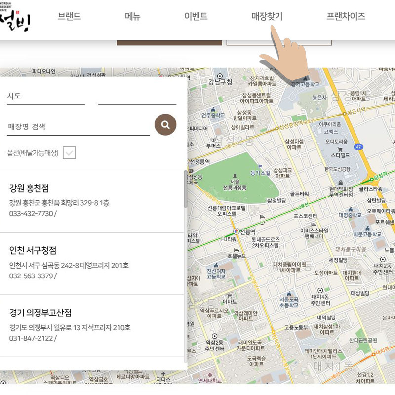 매장 찾기를 통해 설빙 매장을 찾으실 수 있습니다